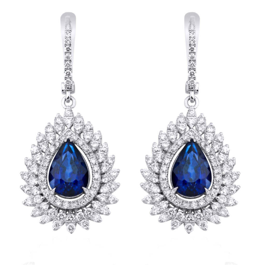 Серьги на английском замке с подвесным элементом в форме капли щедро украшены бриллиантами круглой огранки и насыщенного синего цвета сапфирами огранки груша. Такое сочетание камней придает серьгам свою неповторимую игру цвета и особенный блеск.