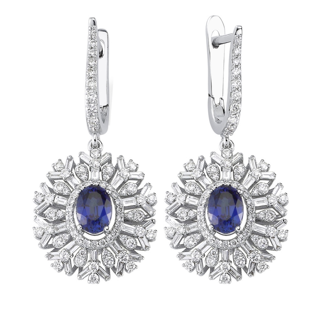 Серьги на английском замке с подвесным элементом в форме снежинки щедро украшены бриллиантами круглой и багетной огранки и насыщенного синего цвета сапфирами огранки овал.