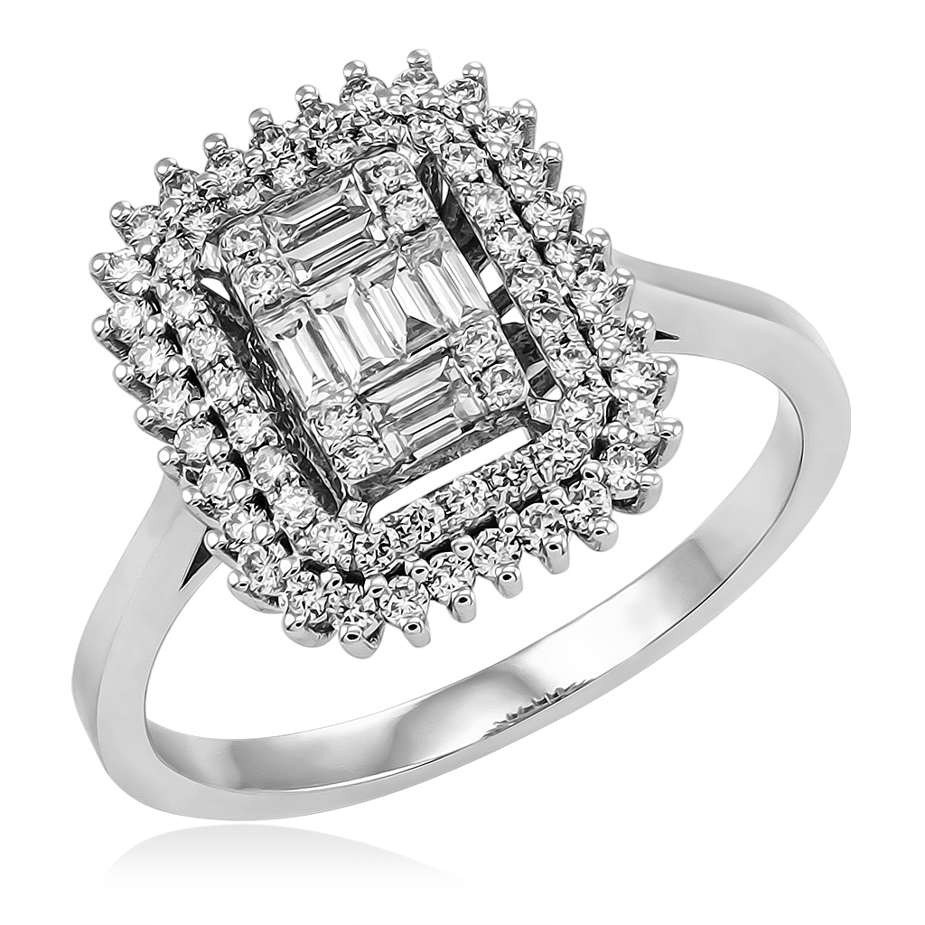 В центре прямоугольной верхушки расположены багетные и круглые бриллианты. По периметру композицию дополняют маленькие круглые бриллианты, усиливающие блеск и глубину света. Сочетание багетной огранки и огранки Кр-57 выделяет это кольцо с бриллиантами среди большого разнообразия форм и придает украшению выразительный объем.