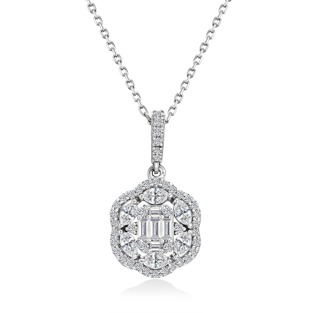 В центре фигурной подвески расположены багетные бриллианты, дополненные бриллиантами круглой огранки. Ушко украшено мелкими бриллиантами.
