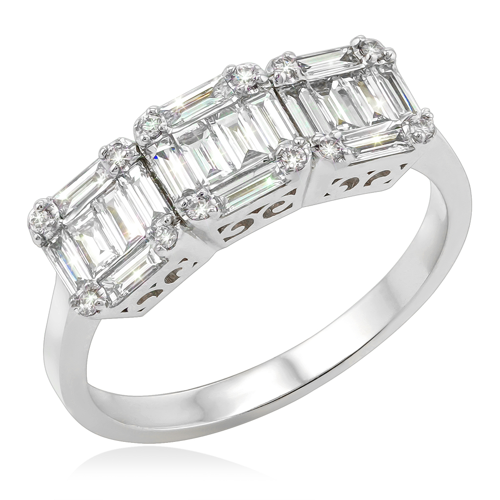 Модель состоит из широкой шинки с тремя прямоугольными декоративными элементами, приподнятыми над основанием. Центральная часть каждой площадки украшена багетными бриллиантами, создающими яркий зеркальный блеск. По периметру верхушка дополнена багетными и круглыми бриллиантами, что усиливает сияние и визуальный объем композиции. Боковая часть выполнена с резным орнаментом, придающим украшению индивидуальность.