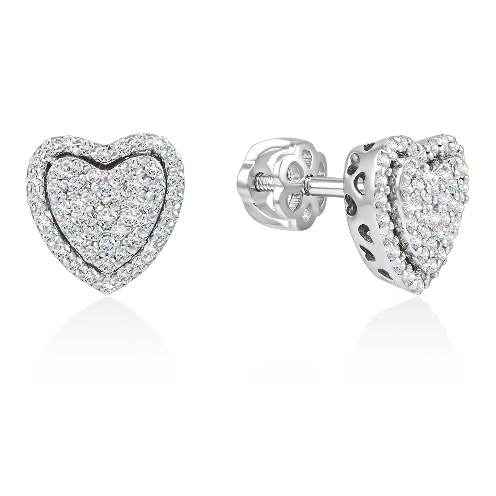 Серьги пусеты выполнены в виде сердца, украшенного россыпью бриллиантов круглой огранки, которые ярко сияют при любом освещении и будут привлекать внимание окружающих.