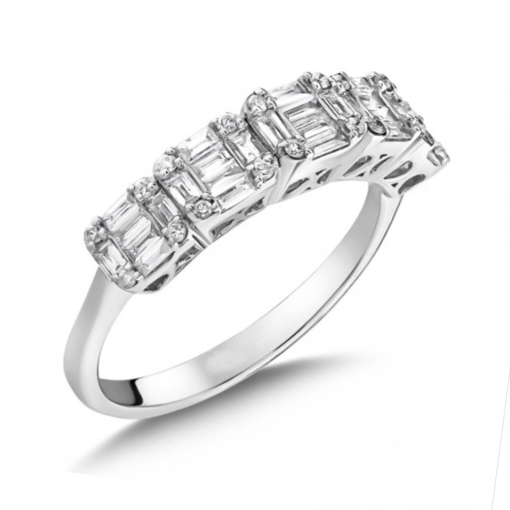 Модель украшена пятью прямоугольными декоративными элементами, приподнятыми над шинкой. Центральная часть каждой площадки инкрустирована багетными бриллиантами, создающими зеркальный блеск и выразительное мерцание. По углам декоративная верхушка дополнена круглыми бриллиантами, усиливающими игру света. Боковая часть выполнена с резным орнаментом, что подчеркивает индивидуальность и премиальный характер кольца из белого золота 585 пробы.
