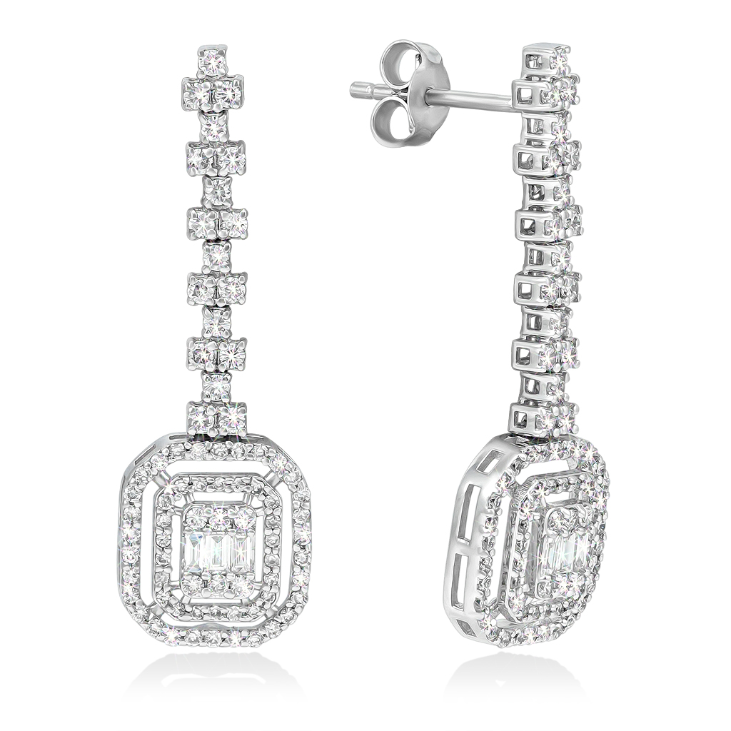 Серьги-пусеты с фигурным подвесным элементом щедро украшены бриллиантами разного размера круглой и багетной огранки. Сочетание круглых и багетных бриллиантов формирует объемную композицию и создает плотное мерцание, благодаря чему серьги из белого золота выглядят эффектно при любом освещении.