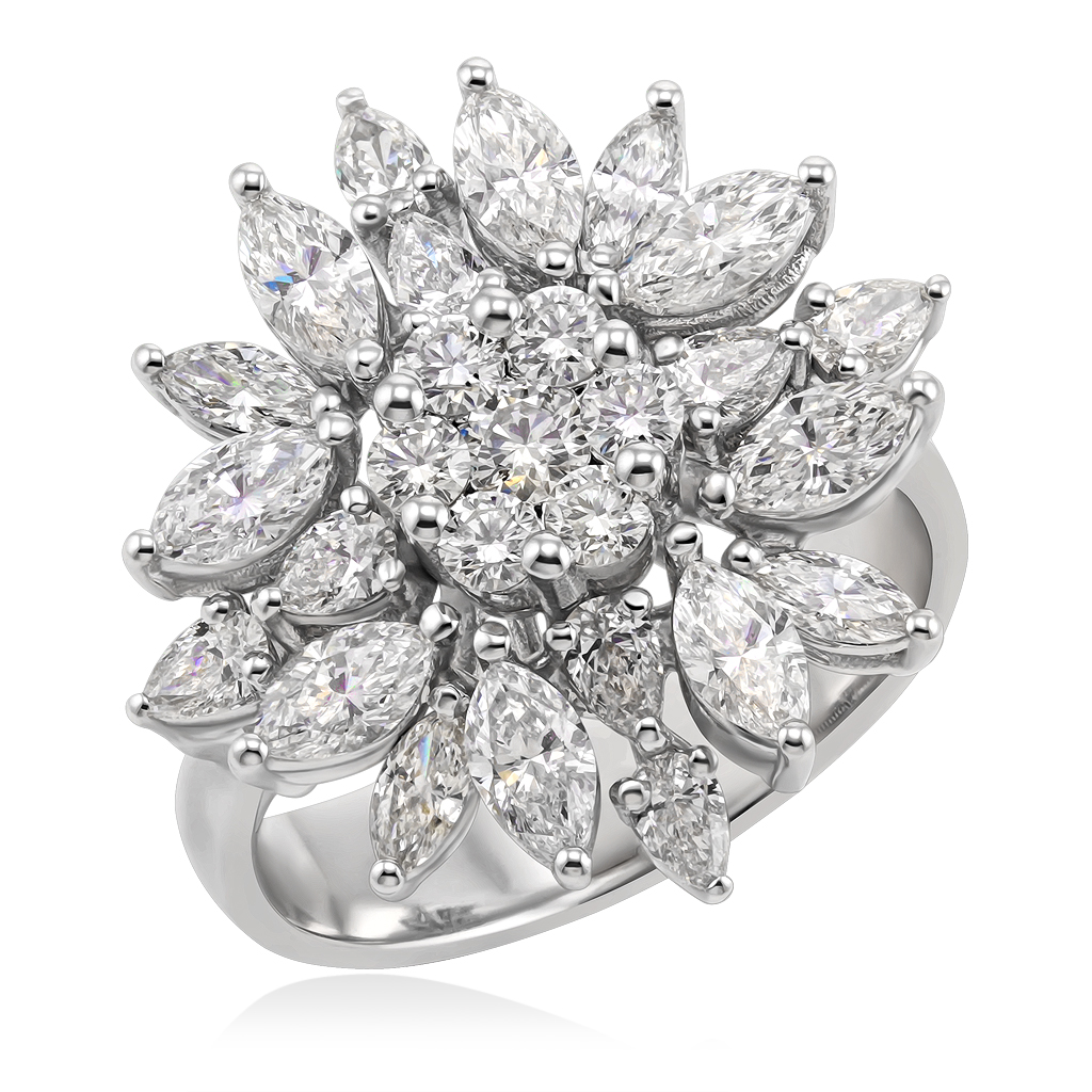 Великолепное нарядное кольцо из белого золота с бриллиантами украсит Ваш праздничный образ и привлечет внимание окружающих.