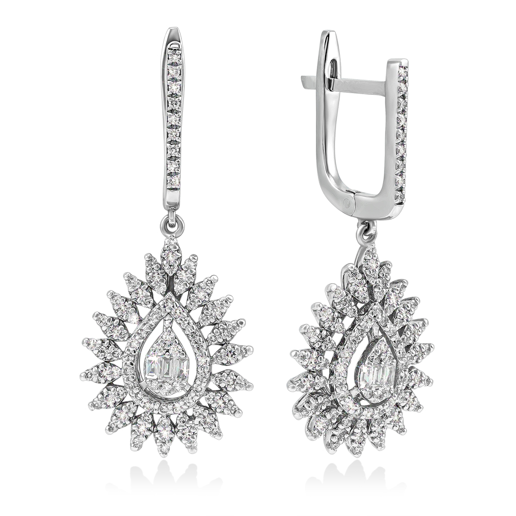 Модель выполнена в фантазийной форме на английском замке с подвесными элементами в виде капли. Подвеска щедро украшена бриллиантами круглой огранки разного размера, создающими плотное мерцание. В центре каждой серьги расположены три бриллианта багетной огранки, формирующие геометрический акцент и усиливающие зеркальный блеск.