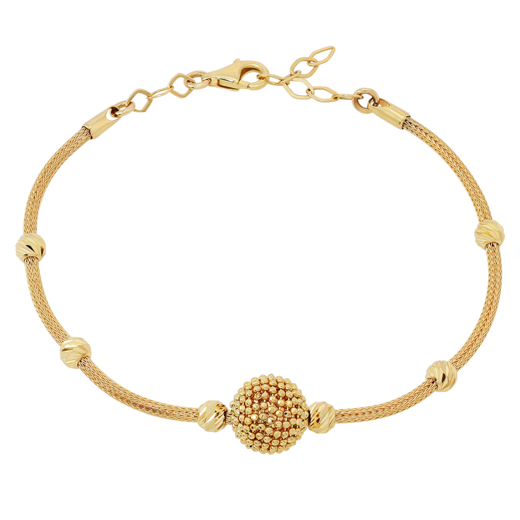 Итальянский браслет из желтого золота 585 пробы от бренда Mostar Jewellery- отличное украшение для себя и в подарок. Изящное фантазийное плетение очень красиво смотрится на руке и подходит для любого случая. Плетение в виде шнурка украшено элементами из облегченных шариков разного размера. Центральный шарик состоит из мелких шариков с алмазной огранкой, которая придает браслету нежный блеск.