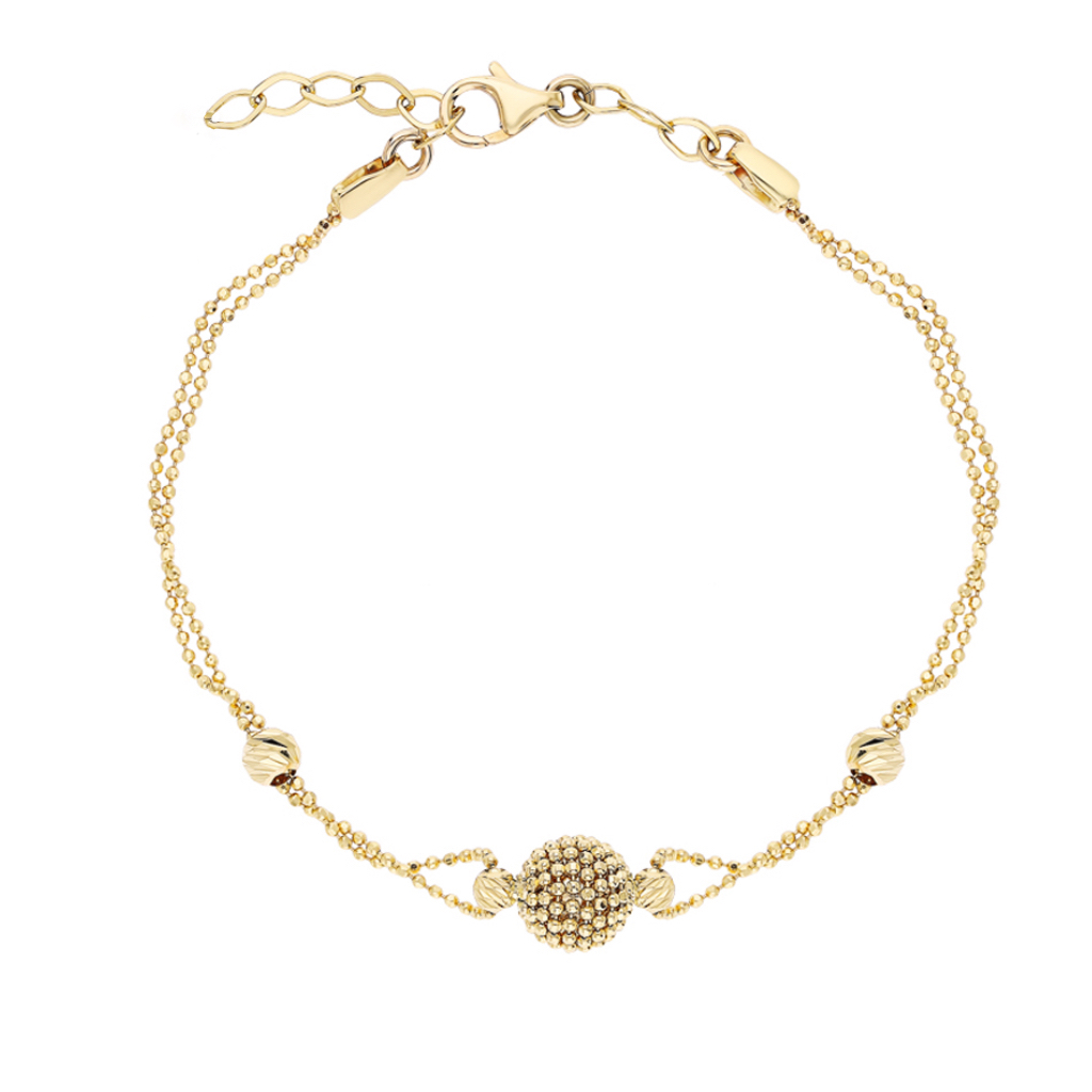 Браслет состоит из тонкой цепочки из шариков и декоративных элементов-шариков. Весь браслет обработан алмазной огранкой, которая придает яркий переливающийся блеск.