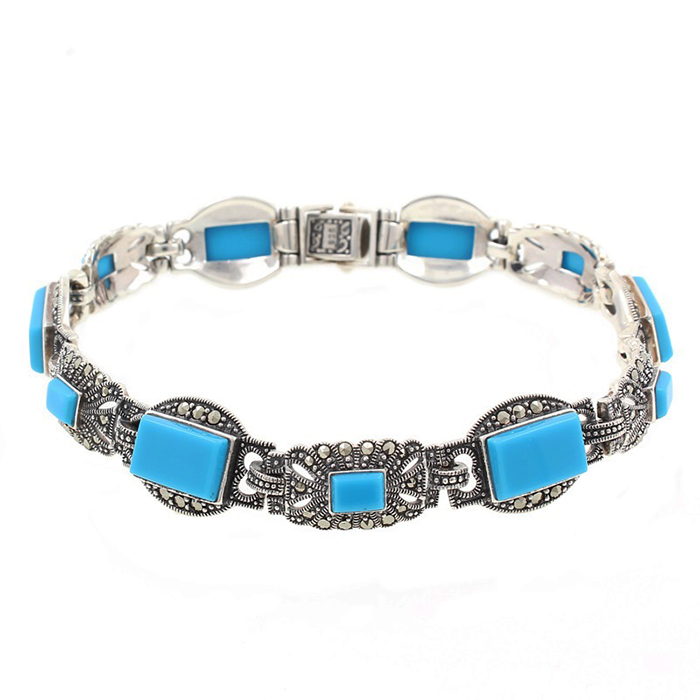 Серебряный браслет с бирюзой, артикул 170642 по цене 13790 руб. в наличии в салонах Город Золотой. Изделие имеет внешний вид "Фантазия", белый цвет, весом 20,94 грамм.