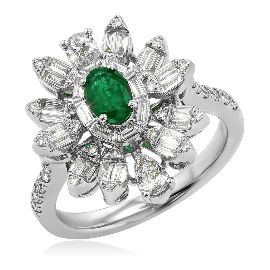 Великолепное нарядное кольцо из белого золота с бриллиантами и изумрудами украсит Ваш праздничный образ и привлечет внимание окружающих. Кольцо фантазийной формы щедро украшено бриллиантами разного размера круглой и фантазийной огранок и насыщенными ярко-зелеными изумрудами огранки овал. Такое сочетание камней придает украшению свою неповторимую форму, контраст цвета и особенный блеск. украшенная бриллиантами шинка придает кольцу массивный вид. Кольцо выглядит роскошно и дорого, подойдет для торжественных событий, для свадьбы и для выступлений на сцене, ярко сверкая при свете софитов. Можно подобрать серьги и колье такой же модели. В комплект к украшению предоставляется подарочная упаковка, которая станет приятным дополнением к Вашей покупке. Украшение прошло клеймение в Российской Государственной Инспекции пробирного надзора, что подтверждает и гарантирует качество производителя. Все наши украшения из золота имеют пробу, именник завода и УИН (Уникальный Индивидуальный Номер), по которому на сайте пробирной палаты РФ можно проверить изделия. Проба нанесена лазерным методом гравировки, который не оставляет вмятин на изделии, и видна под углом в 45 градусов. Гарантия на брендовое ювелирное изделие составляет шесть месяцев со дня передачи товара потребителю.