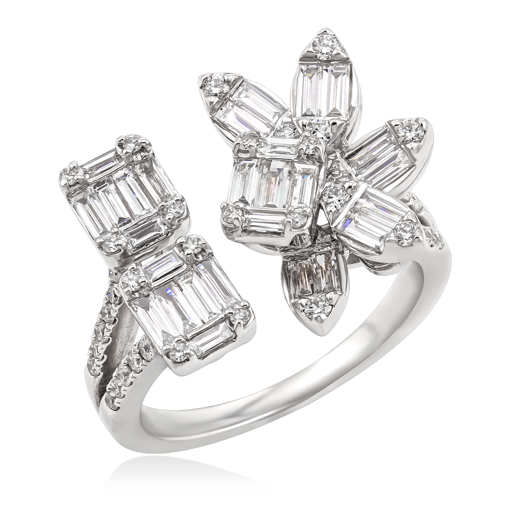 Незамкнутое кольцо с фигурным фантазийным декоративным элементом щедро украшено бриллиантами разного размера круглой и багетной огранок.