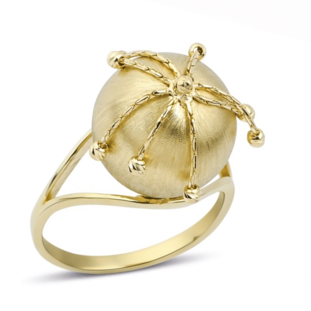 Кольцо из желтого золота 585 пробы - отличное украшение для себя и в подарок. Декоративная верхушка выполнена в форме шара с кисточками, украшенными мелкими шариками с алмазной огранкой. Матовая сатинированная поверхность изящно гармонирует с блестящими шариками. Дизайн фантазийный и очень необычный, а сочетание матового и блестящего придает ему еще больше шарма.