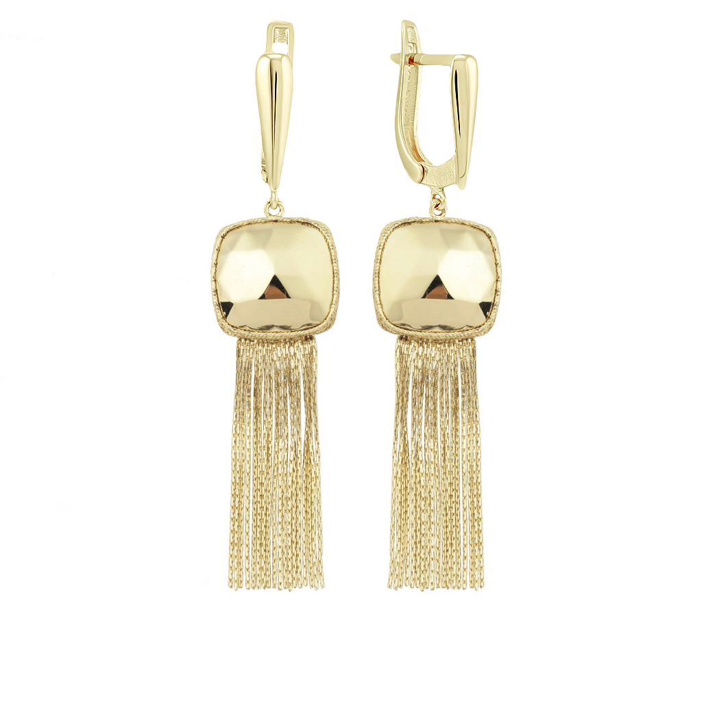 Подвесной элемент квадратной формы размером 16х16 мм, общая длина серьги 50 мм. В комплект к серьгам рекомендуем приобрести гарнитур колье и кольцо.