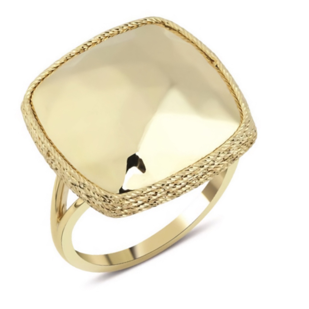 Объемная глянцевая поверхность кольца квадратной формы выделяет это украшение своим необычным стилем и привлекает внимание окружающих.