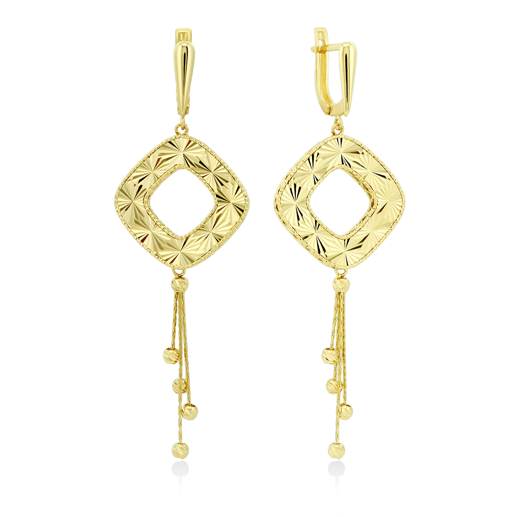 Он выполнена в форме квадрата с яркой лучевой алмазной огранкой. Подвесной элемент объемный и двусторонний, украшен кисточками.
