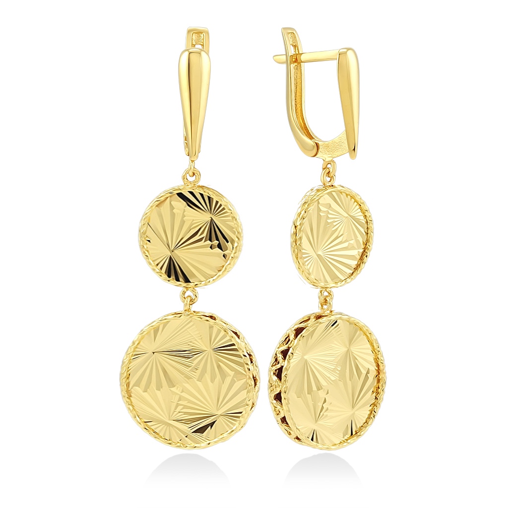 Серьги изготовлены из желтого золота 585 пробы. Гладкое основание на английскмм замке с облегченным подвесным элементом, состоящим из двух круглых подвесок с яркой лучевой алмазной огранкой.