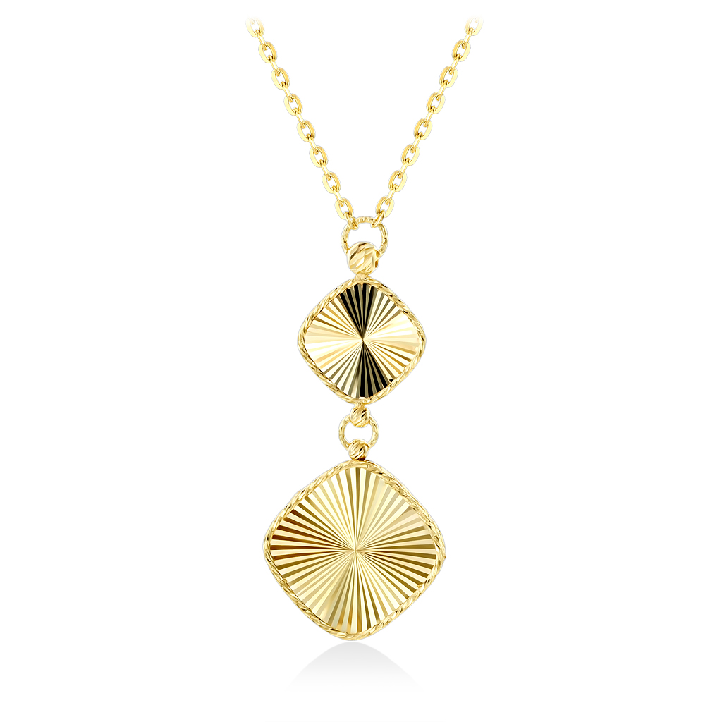 Подвеска объемная и двусторонняя. Колье необычайно красиво сверкает и переливается, такое украшение как нельзя лучше подойдет для праздничного образа. Общая длина подвески составляет 3,5 см, размеры элементов 10х10 мм и 15х15 мм. К колье можно подобрать серьги и кольцо такой же модели. Современные ювелирные изделия легко сочетаются с любой одеждой.
