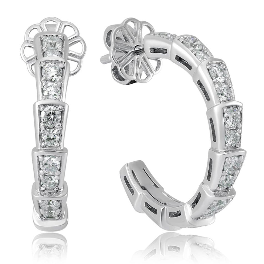 Поверхность серег щедро инкрустирована мелкими бриллиантами круглой огранки, создающими плотное сияние и роскошный блеск. Благодаря равномерной закрепке камней серьги из белого золота с бриллиантами выглядят объемно и ярко при любом освещении.