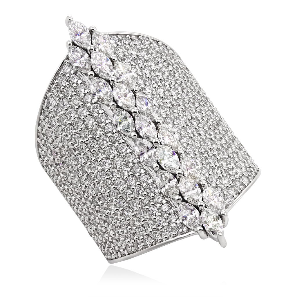 Великолепное нарядное кольцо из белого золота с бриллиантами украсит Ваш праздничный образ и привлечет внимание окружающих. Широкое кольцо с фантазийным декоративным элементом по центру щедро украшено бриллиантами разного размера круглой и фантазийной огранок. Такое сочетание камней придает украшению свою неповторимую форму и особенный блеск.
