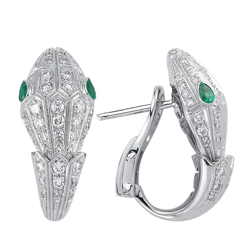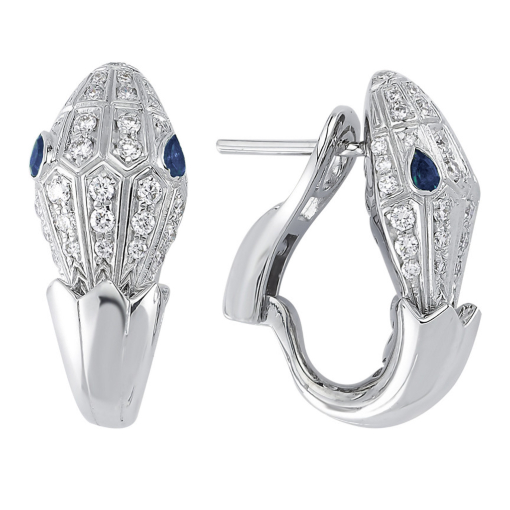 Серьги изготовлены из белого золота 585 пробы в виде объемной стилизованной головы змеи в стиле Bvlgari. Змея - один из самых известных и популярных символов ювелирного искусства этого знаменитого бренда, который уже много лет используют многие производители украшений. Голова щедро усыпана мелкими бриллиантами круглой огранки, глаза выполнены из синих сапфиров огранки груша. Такое украшение предпочтут ценители роскошных и именитых украшений.