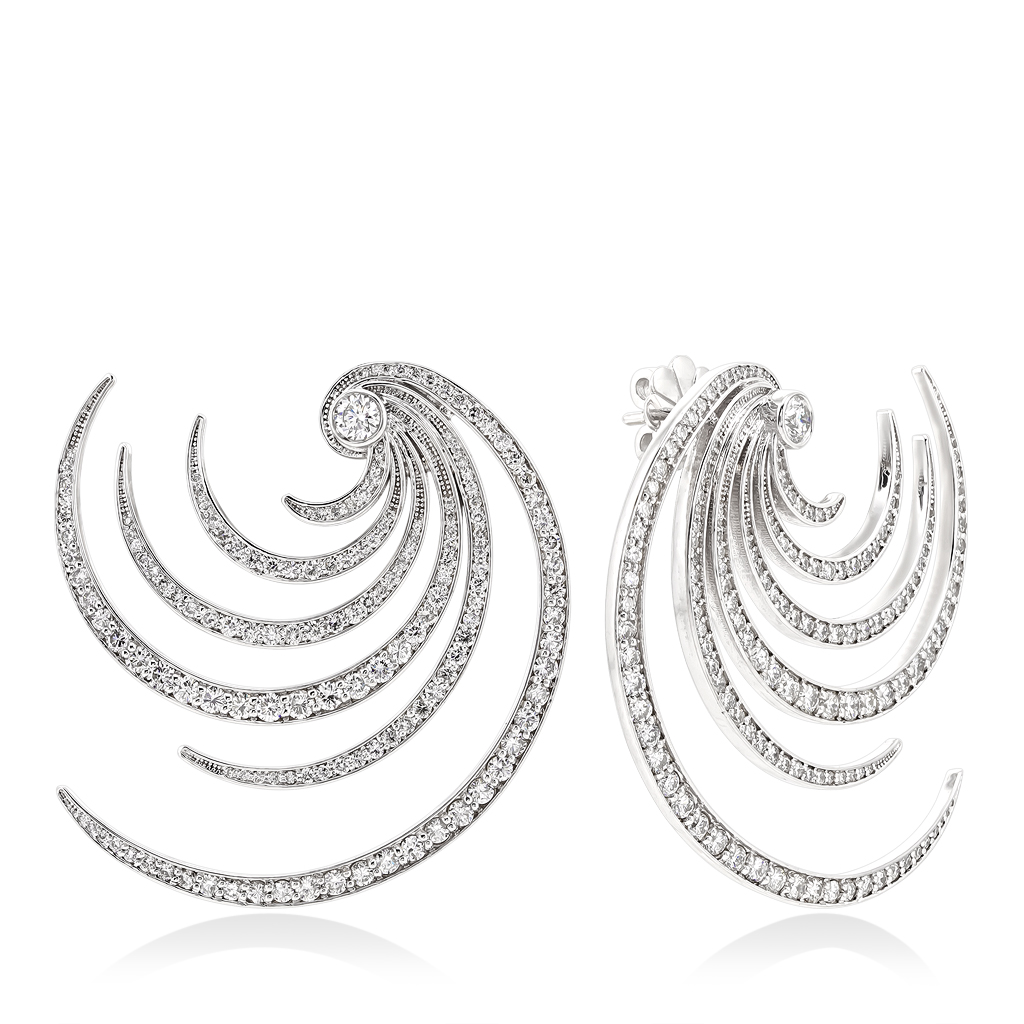 Великолепные нарядные серьги из белого золота с бриллиантами украсят Ваш праздничный образ и привлекут внимание окружающих. Серьги пусеты с необычным фигурным подвесным элементом щедро украшены бриллиантами круглой огранки. Такое сочетание камней придает серьгам свою неповторимую форму и особенный блеск.