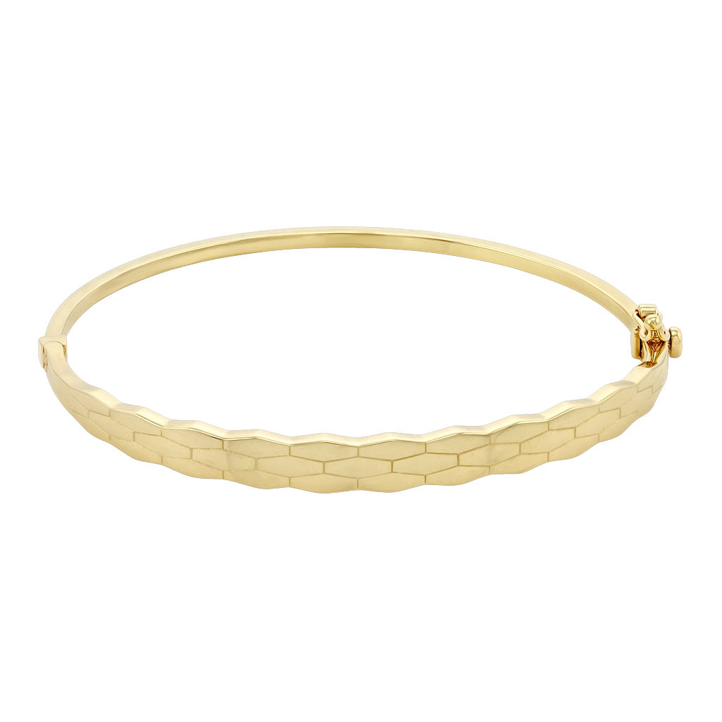 Браслет из золота 585 пробы - отличное украшение для себя и в подарок. Жесткий браслет в виде обруча никогда не выходит из моды и подходит для любого мероприятия, сочетается с разными образами. По лицевой части он имеет утолщение и декоративную обработку, что добавляет украшению нарядный вид.