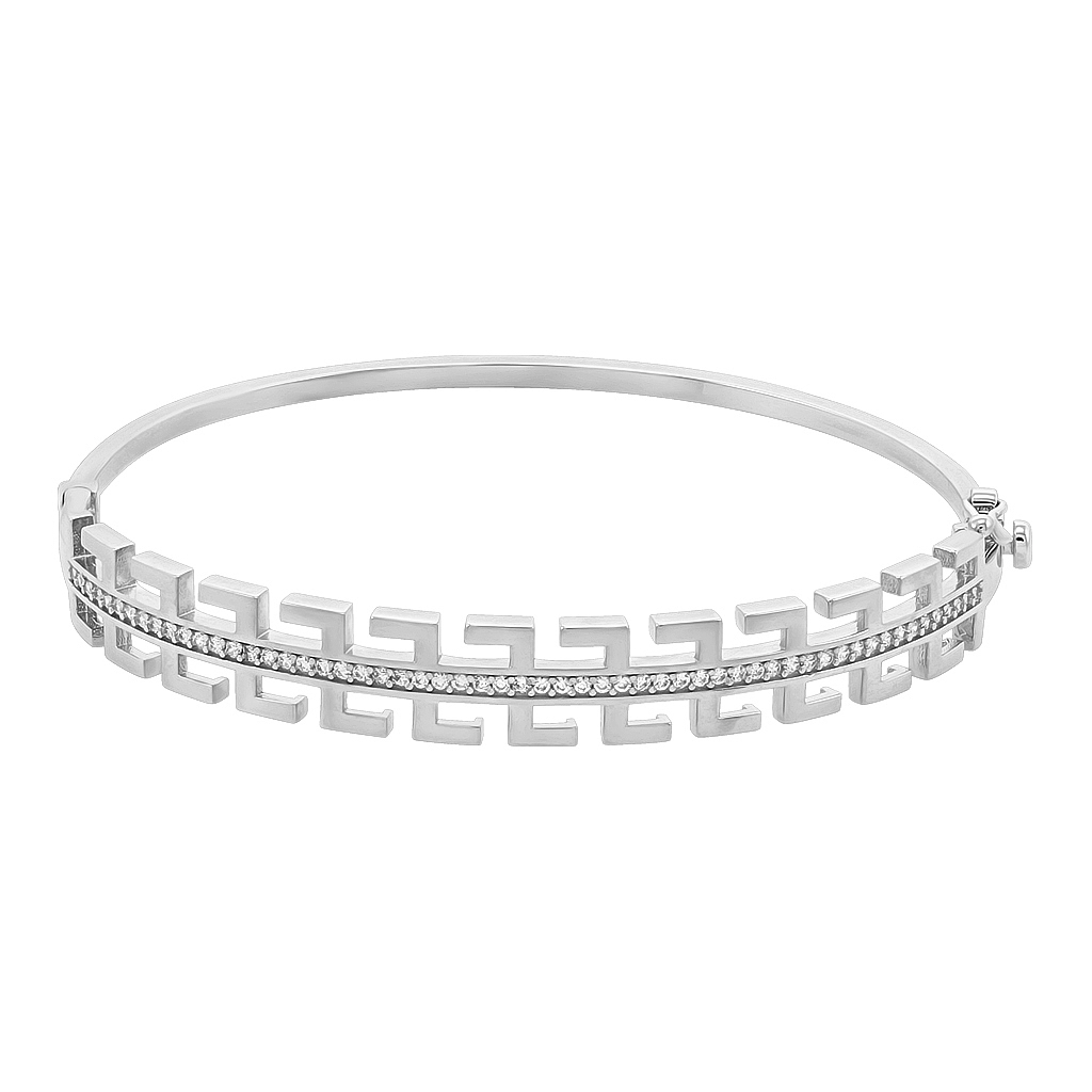 Золотой браслет 585 пробы — жёсткий обруч с декоративным греческим орнаментом, украшенным мелкими фианитами. Стильное украшение для женщин подходит для повседневного ношения и праздничного образа, а также станет отличным подарком. Пустотелая конструкция делает браслет лёгким, а усиленный замок с фиксирующей петлёй — надёжным.