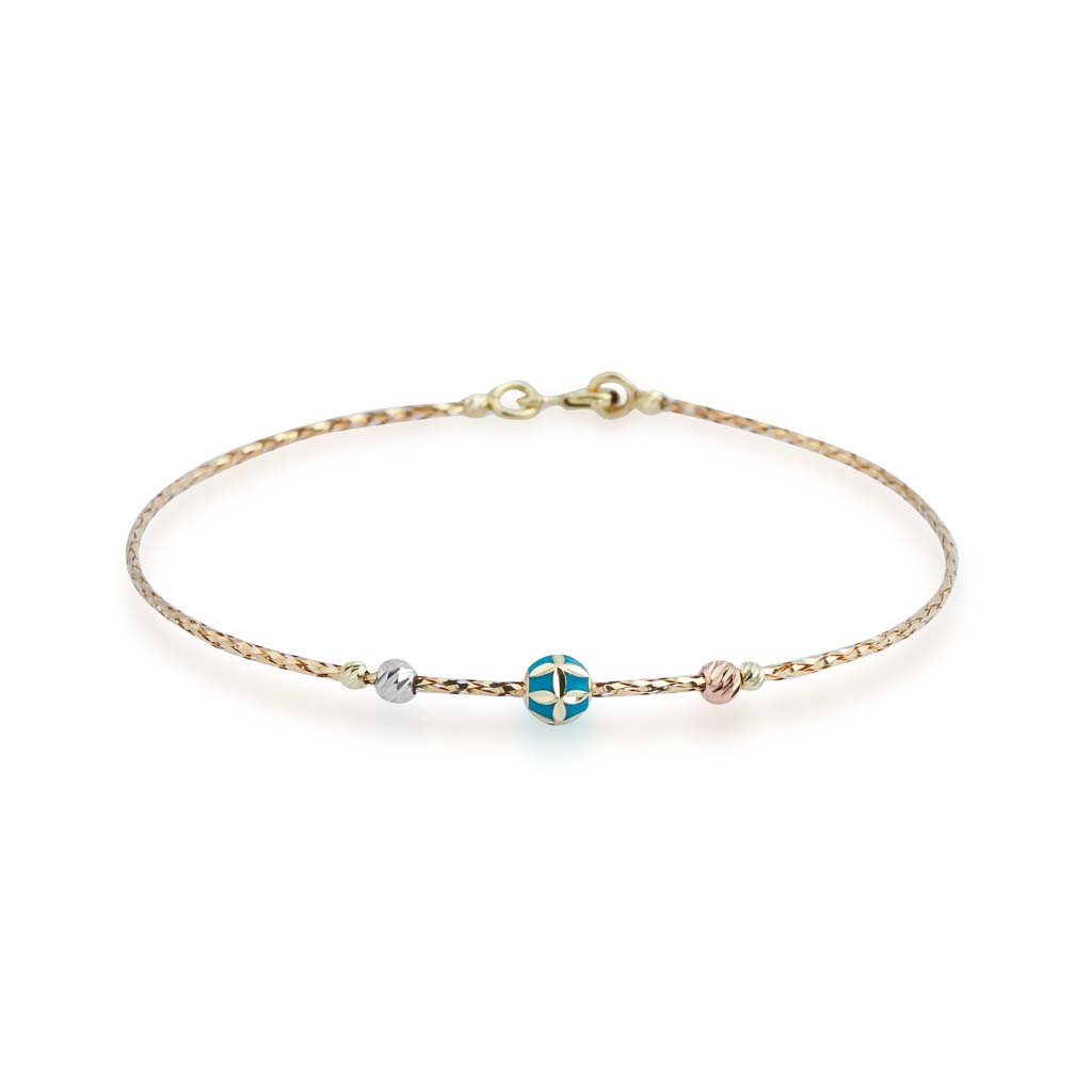 По длине браслет украшен разными шариками: золотыми и с цветной эмалью. Они обработаны алмазной огранкой, поэтому ярко сверкают при любом освещении.