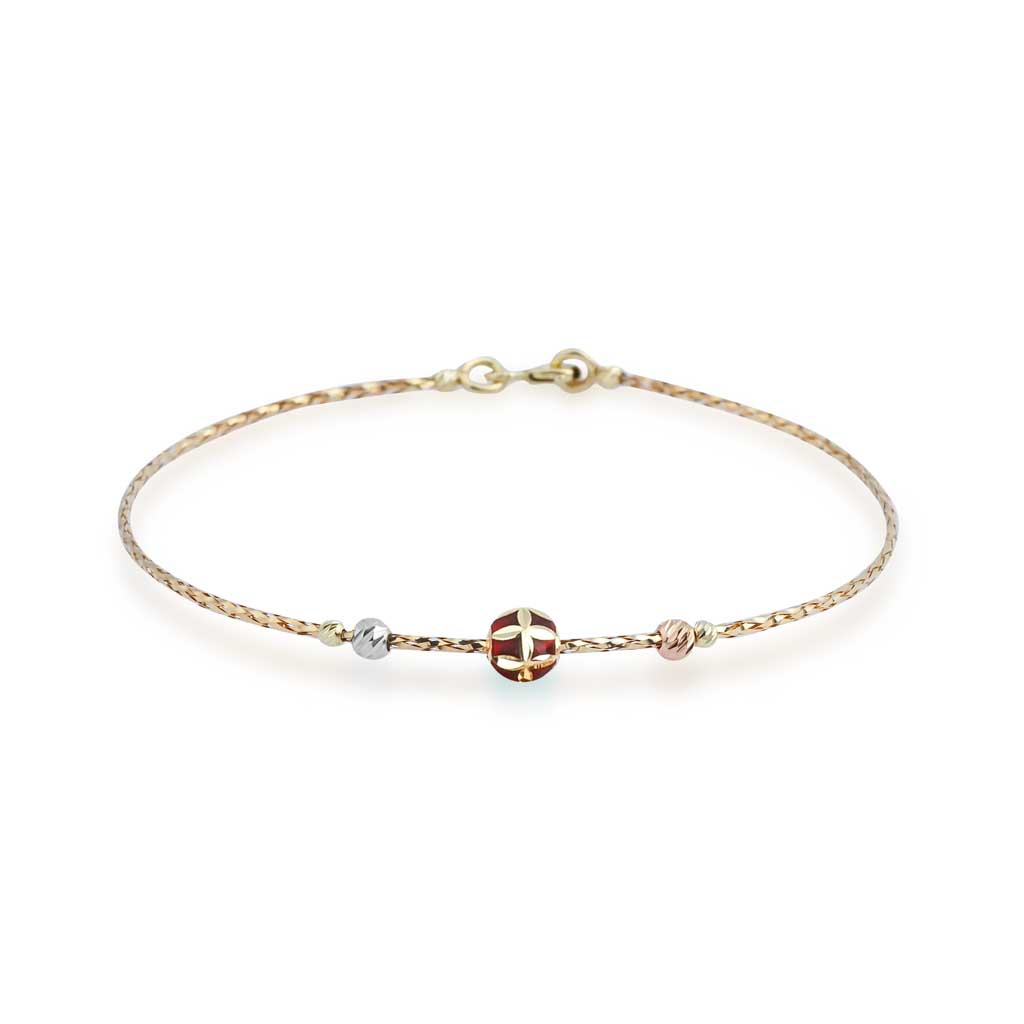 Элегантный декоративный браслет из золота 585 пробы — гибкое плетение в виде тонкой косички с чередующимися золотыми и цветными эмалевыми шариками, обработанными алмазной огранкой для яркого сияния при любом освещении. Регулируемая застёжка с цепочкой и подвеской-шариком с фианитом обеспечивает удобство и изысканный вид. Ширина браслета 2 мм, диаметр шариков 4 мм.