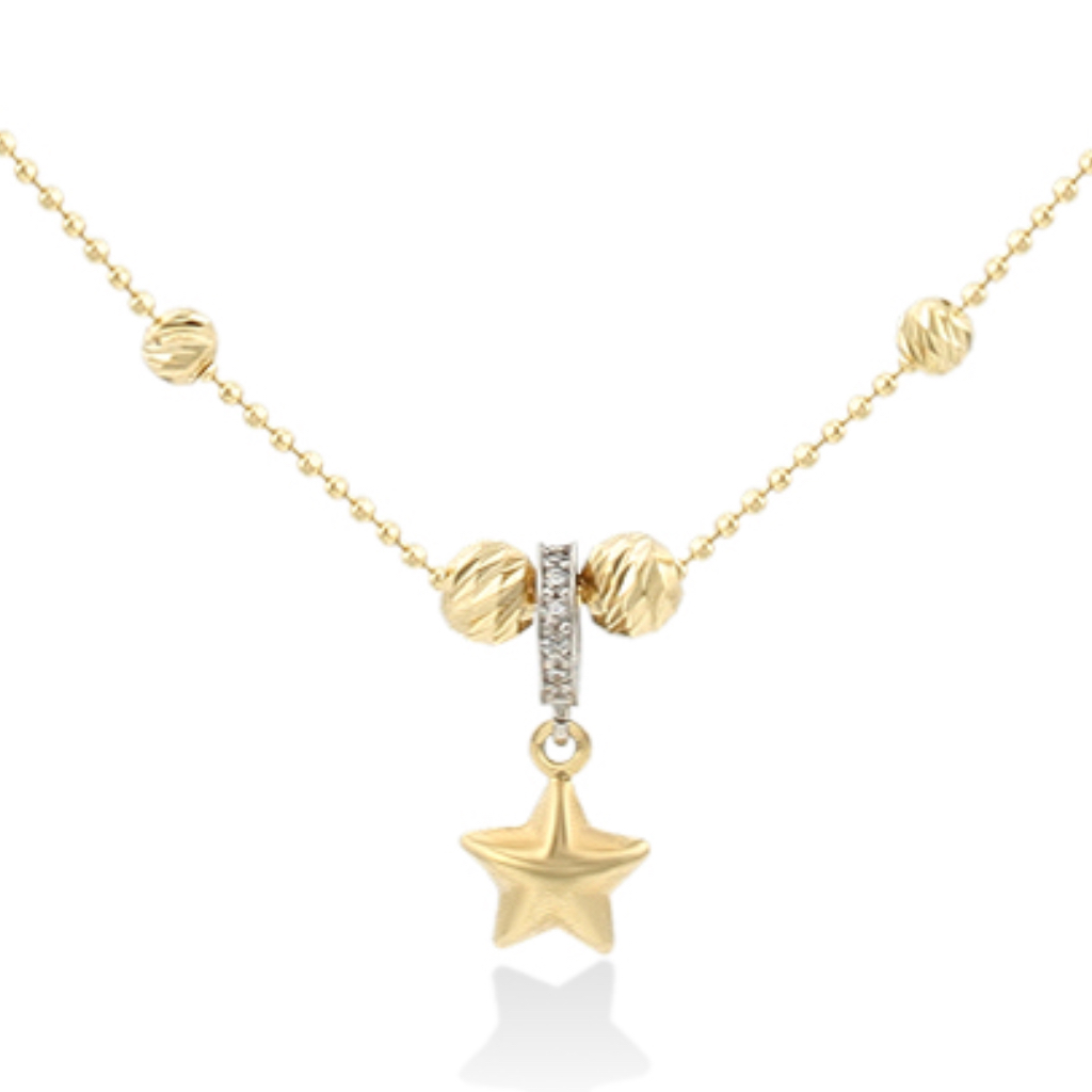 Колье от бренда Mostar Jewellery выполнено из желтого золота 585 пробы. Стильное минималистичное украшение, состоит из цепочки из маленьких и больших золотых шариков, что создает объемную фактуру и придает дополнительный блеск.