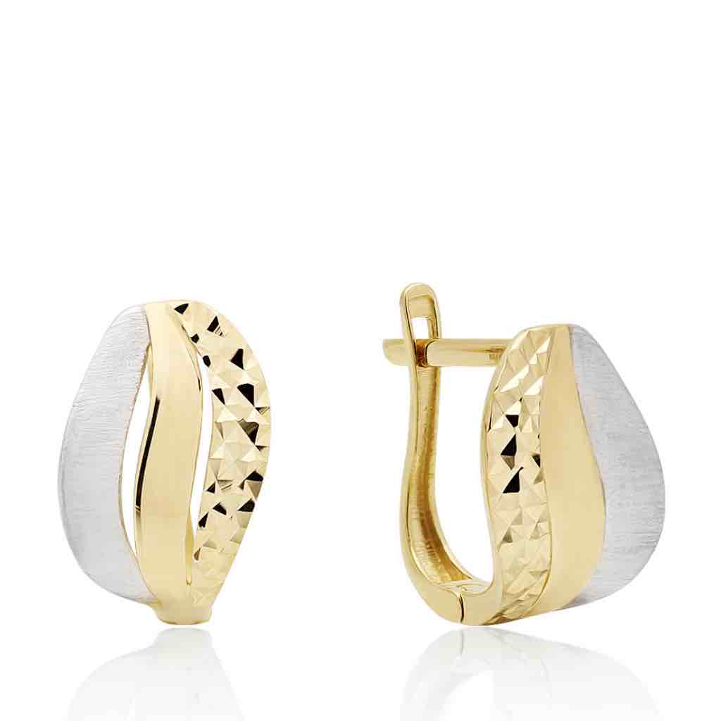 Серьги выполнены из желтого золота 585 пробы с покрытием белым родием. Эта модель облегченная, на одной стороне основы нанесена алмазная грань в форме кристалла. Такая обработка придает искрящийся блеск при попадании лучей света. Сдержанная модель, подойдет на все случаи жизни.