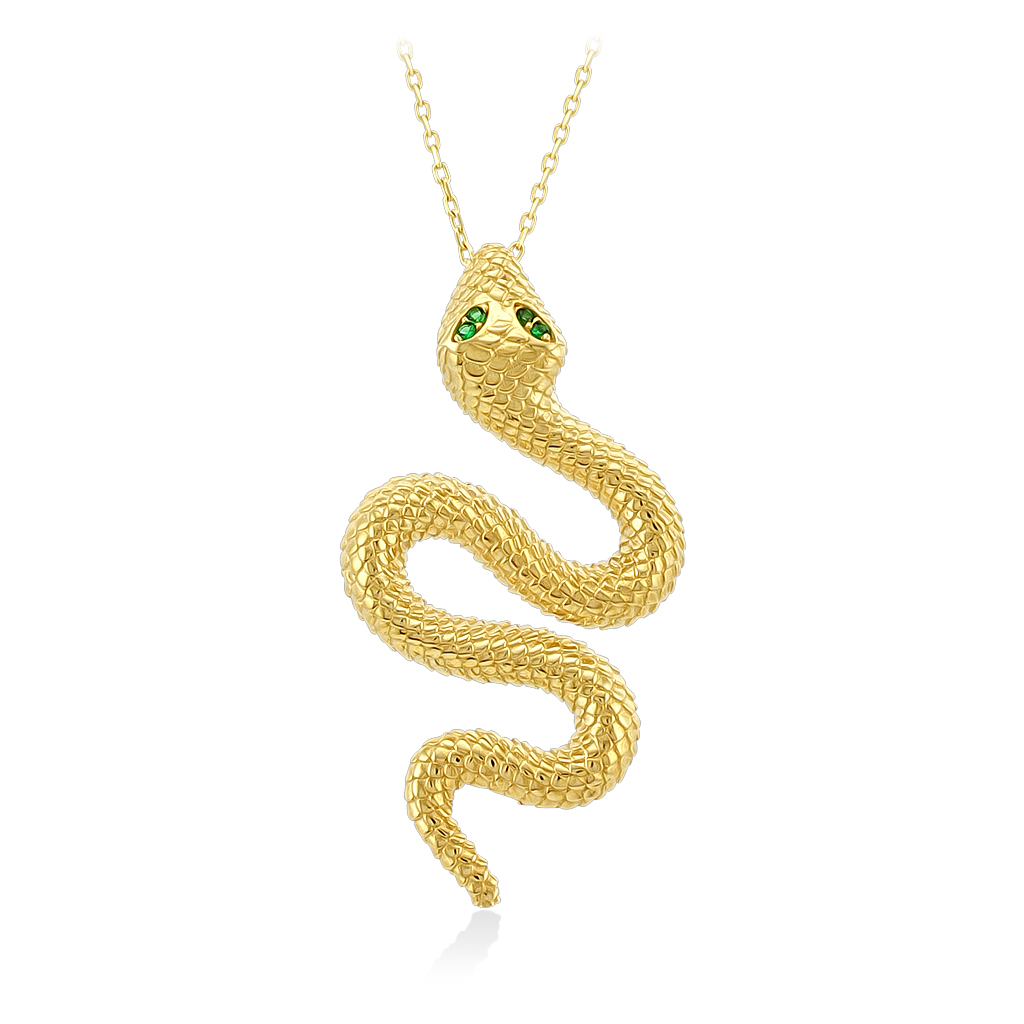 Колье изготовлено из желтого золота 585 пробы со вставками из фианитов. Оно состоит из якорной цепи и подвески в форме змеи, которая красиво извивается в ленту. Специальная обработка поверхности металла имитирует чешуйчатую кожу змеи, глаза украшают цветные фианиты. Такое украшение выделяется своей нетривиальностью и привлекает внимание. Ширина змеи 3 мм, длина подвески 38 мм.