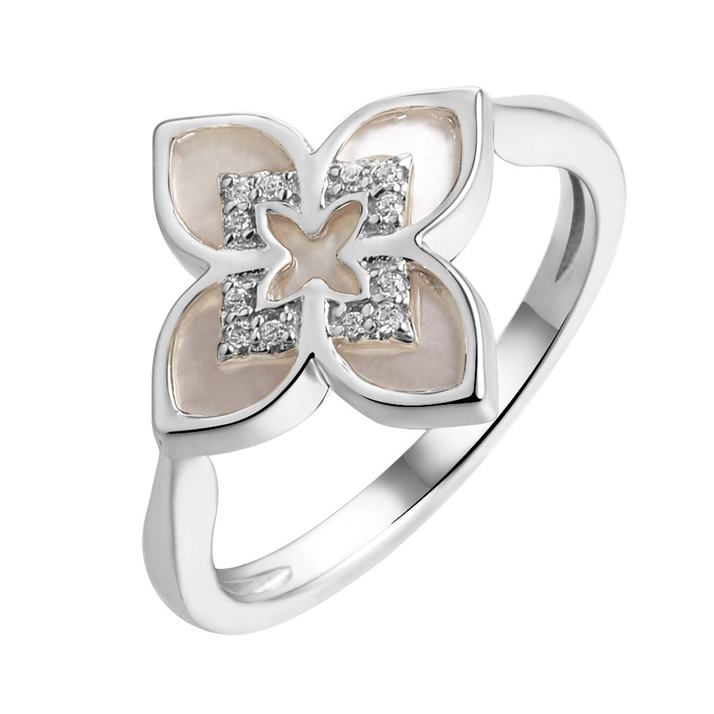 Серебряное кольцо с перламутром, артикул 169075 по цене 3790 руб. в наличии в салонах Город Золотой. Изделие имеет внешний вид "Классика/узор", белый цвет, весом 2,61 грамм.