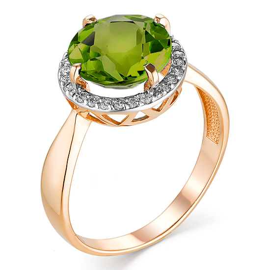 Представляем вам великолепное золотое кольцо 585 пробы с хризолитом и фианитами, созданное известным российским производителем - Ярославским ювелирным заводом.