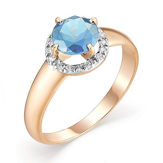 В центре кольца расположен крупный и красивый топаз, который притягивает взгляды своей глубокой и яркой голубой окраской. Он окружен россыпью блистательных фианитов, которые придают украшению дополнительный блеск и шик.