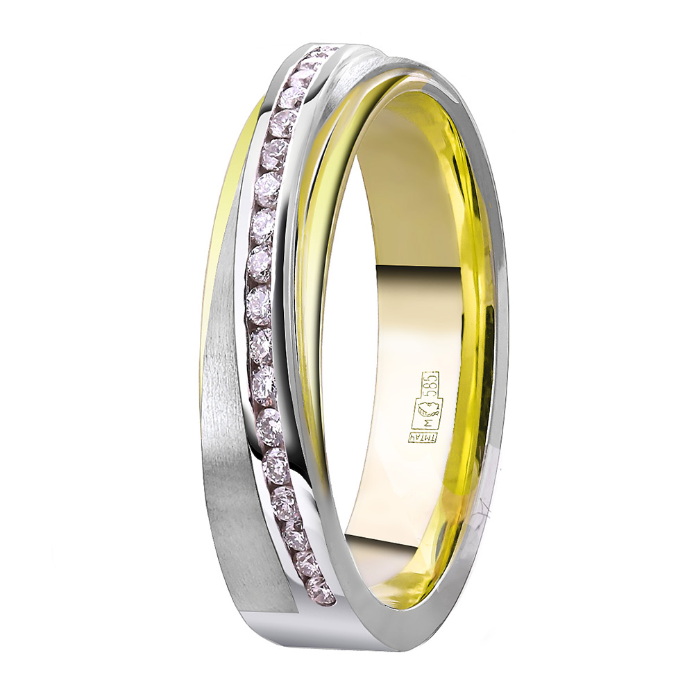 Золотое обручальное кольцо с бриллиантом, артикул 180395 по цене 229362 руб. в наличии в салонах Город Золотой. Изделие имеет внешний вид "КДКЮ318", желто-белый цвет, весом 5,41 грамм.