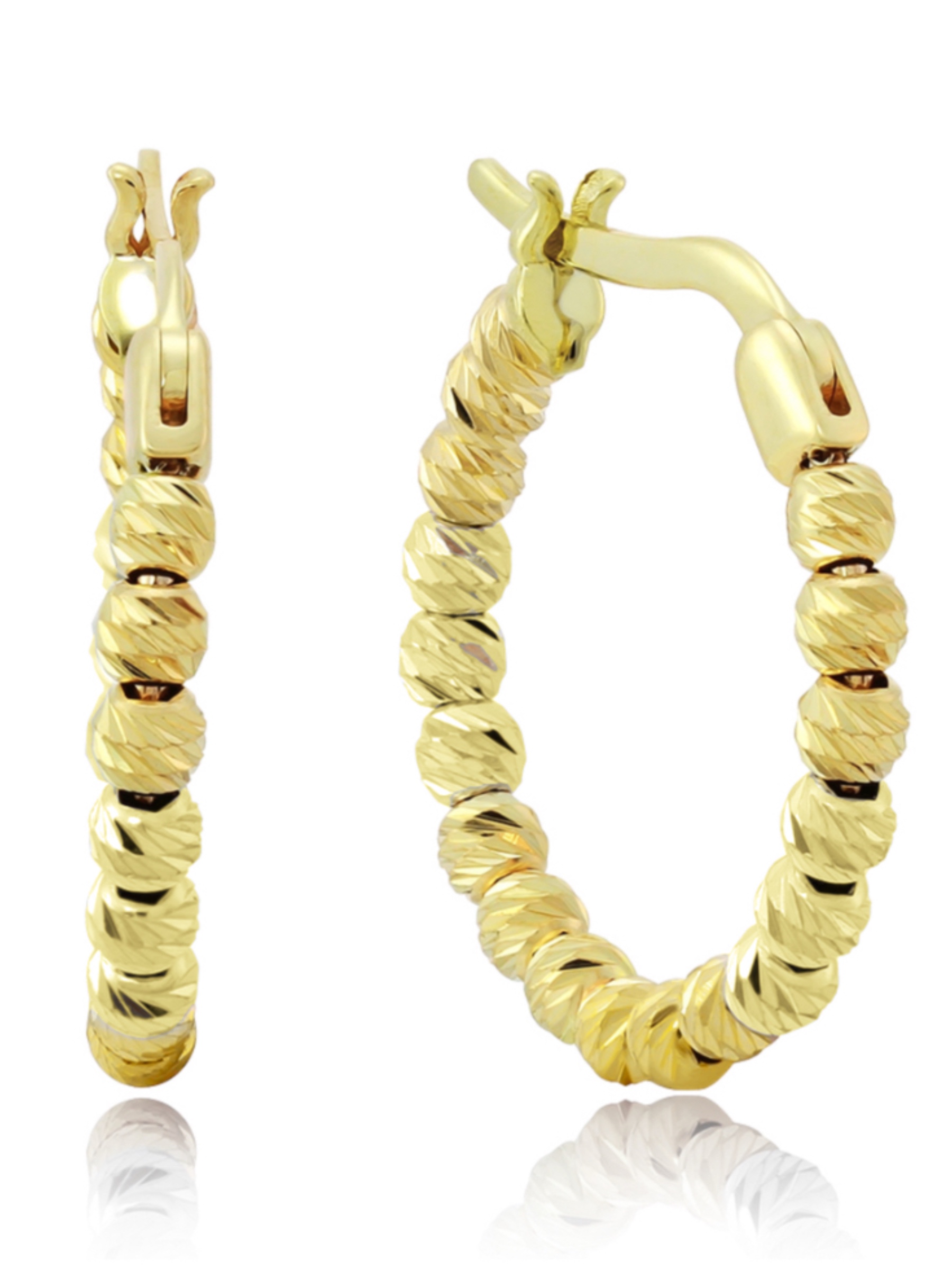 Серьги кольца выполнены из желтого золота 585 пробы лимонного оттенка. Они состоят из маленьких шариков с алмазной огранкой, придающей им красивый искрящийся блеск.