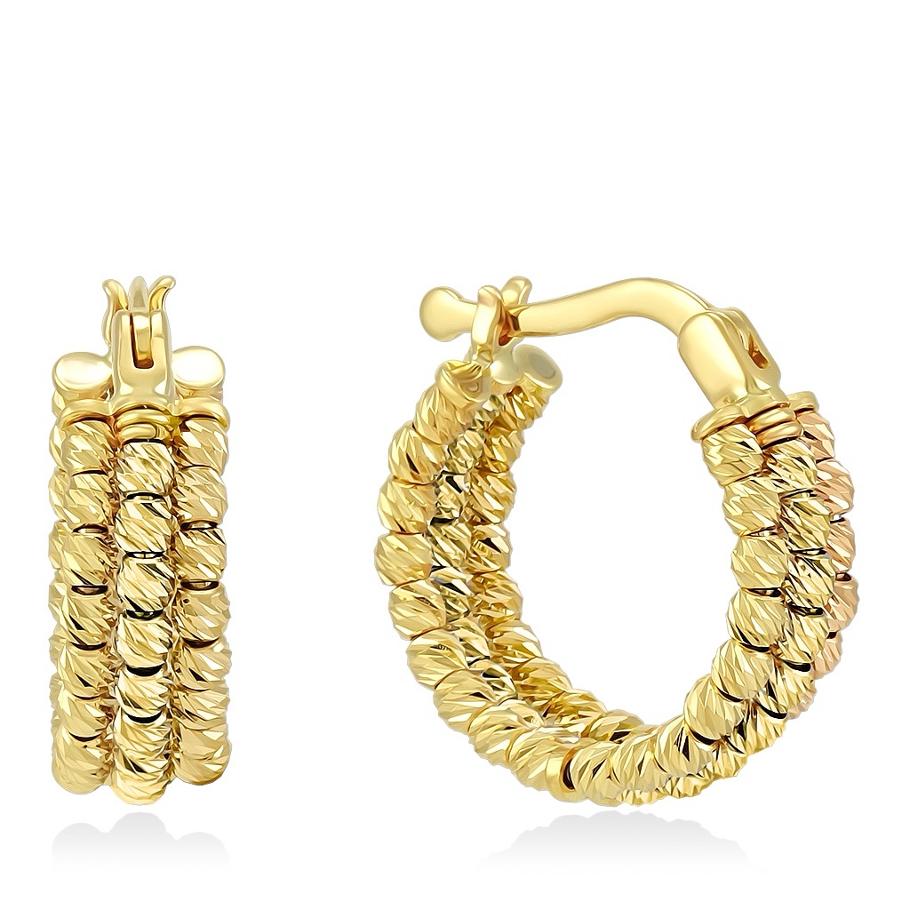 Ювелирные украшения из золота 585 пробы выполнены в форме висячих колец диаметром 17 мм., ширина лицевой стороны 6 мм, диаметр шариков 1 мм.