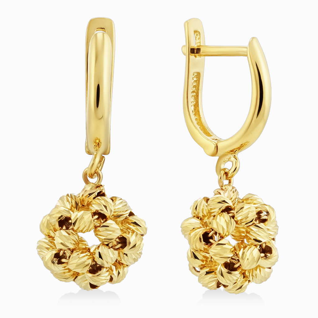 Основание серьги классическое, гладкое, на английском замке, который обеспечивает надежную фиксацию и комфортное ношение . Подвесной элемент состоит из шариков с алмазной огранкой с диаметром 2,5мм, которая придает им подобие бусин и искрится в лучах света.