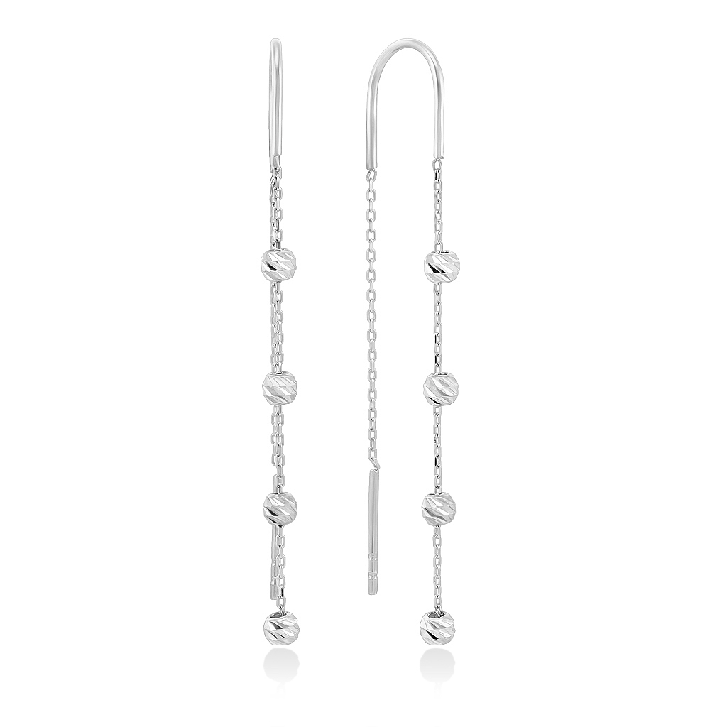 Стильные серьги продевки от бренда Mostar Jewellery изготовлены из золота 585 пробы покрыты белым родием, который защищает от потемнения и придает красивый ровный блеск.