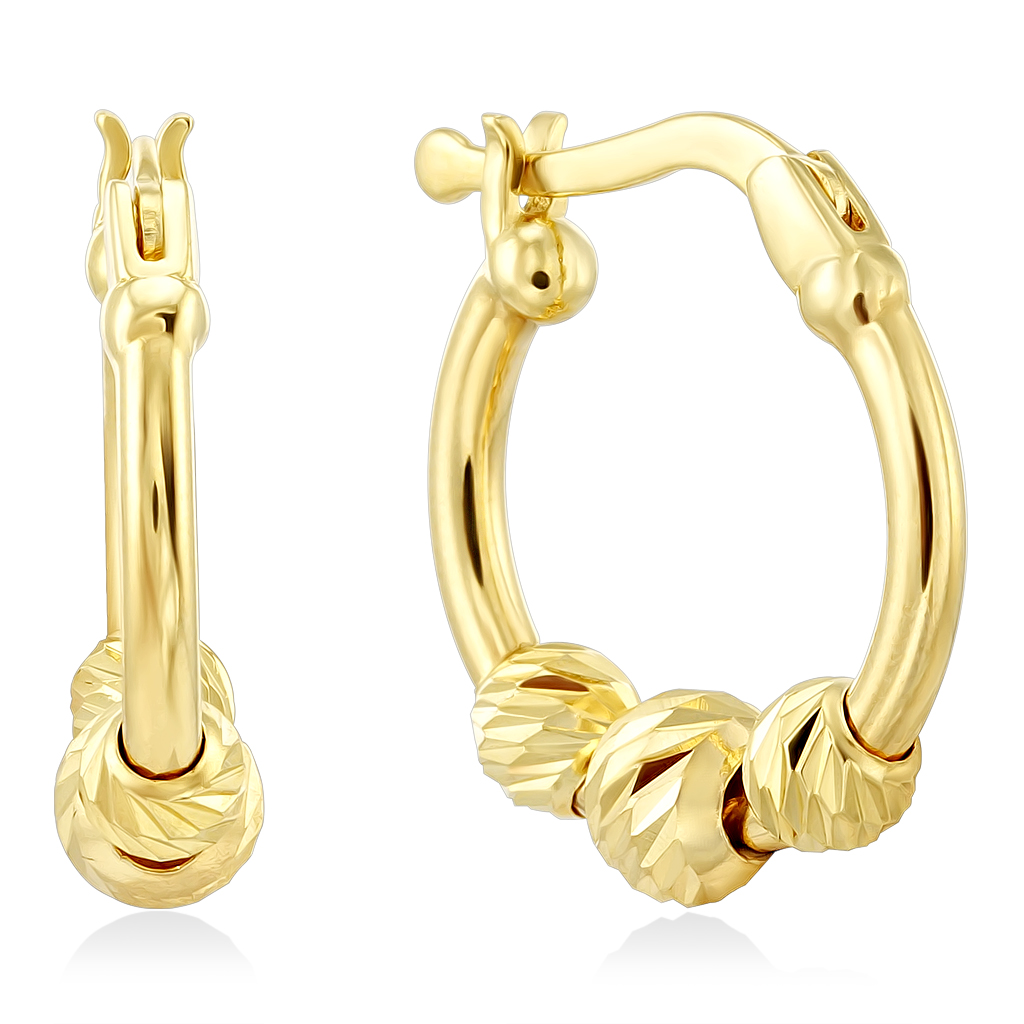 Женские серьги конго из золота 585 пробы. Небольшие легкие сережки украшены декоративными шариками разного размера.