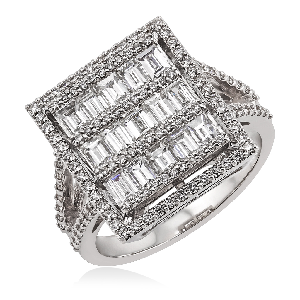 Кольцо с прямоугольной высокой площадкой в виде перстня богато украшено бриллиантами круглой и багетной огранки. Багетные бриллианты закреплены способом Invisible (невидимый), что придает украшению свою неповторимую красоту и особенный, зеркальный блеск.