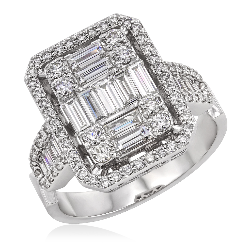 Кольцо с декоративным элементом прямоугольной формы щедро украшено бриллиантами разного размера круглой и багетной огранки.