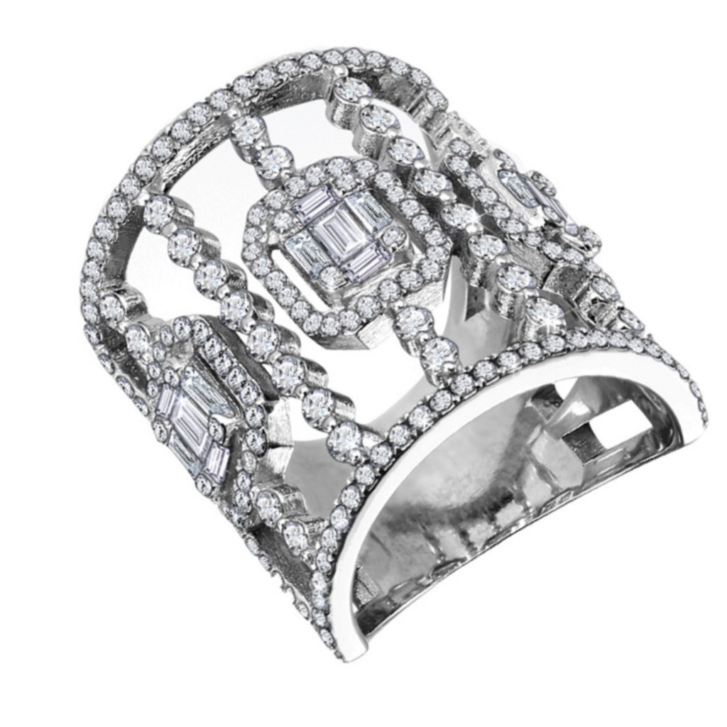 Великолепное нарядное кольцо из белого золота с бриллиантами украсит Ваш праздничный образ и привлечет внимание окружающих. Кольцо с фигурным фантазийным декоративным элементом щедро украшено бриллиантами разного размера круглой и багетной огранок. Такое сочетание камней придает украшению свою неповторимую форму и особенный блеск.