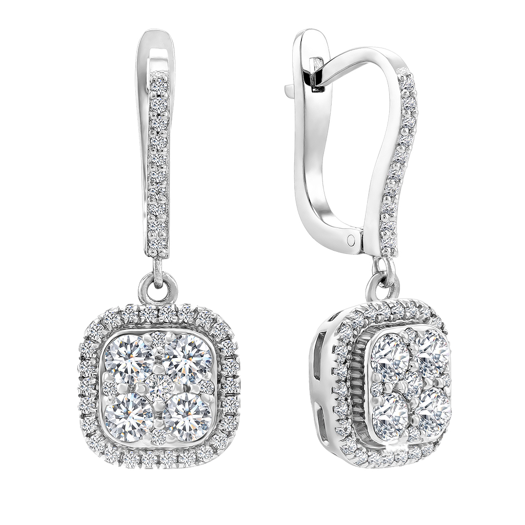 Золотые серьги с бриллиантами всегда в тренде. Эта модель состоит из тонкого основания и подвески квадратной формы с закругленными углами. Центральная часть площадки приподнята и украшена круглыми бриллиантами разного размера, по периметру их дополняют более мелкие бриллианты круглой огранки. Основание тоже украшено бриллиантами, что придает серьгам более праздничный вид. Всего в этой паре серег 80 сверкающих камней. Размер подвески 9х9 мм, высота площадки 4 мм, длина основания 10 мм, штифт 10 мм.