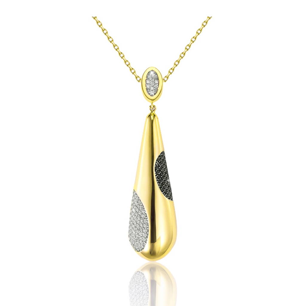 Золотое колье ручной работы. Колье состоит из якорной цепочки и подвески из 2-х элементов в форме объемной капли. Подвеска украшена белыми и темными фианитами не снимается с цепи. Общая длина подвески 52 мм, максимальная ширина 13 мм. Отличное украшение для себя и в подарок.
