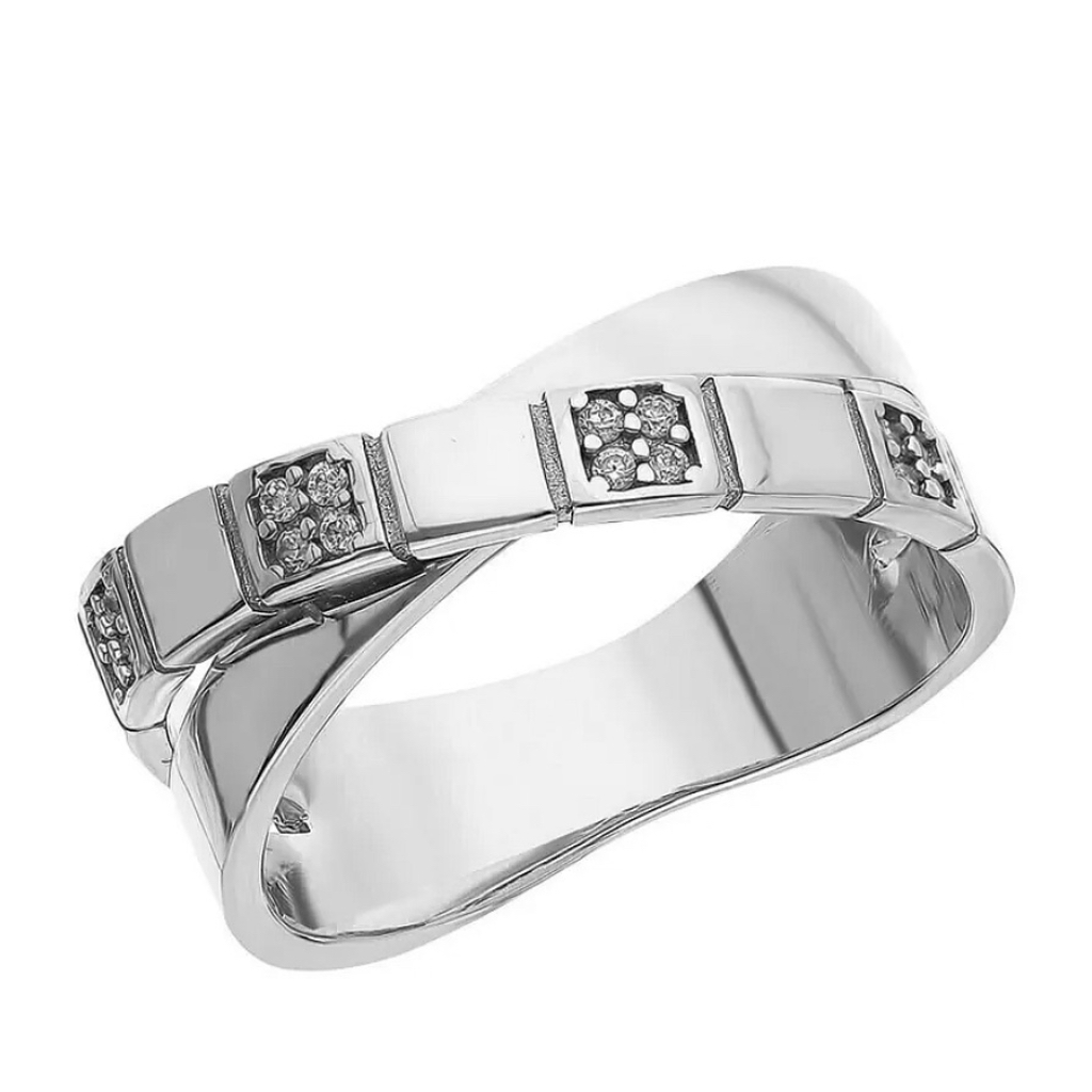 Кольцо изготовлено из белого золота 585 пробы. Широкая перекрещенная двойная шинка украшена мелкими фианитами. Кольцо выглядит сдержанно и в то же время очень стильно и современно. Оно украсит образ деловой и активной женщины. Ширина каждой части шинки составляет 4 мм. Хороший вариант для подарка.