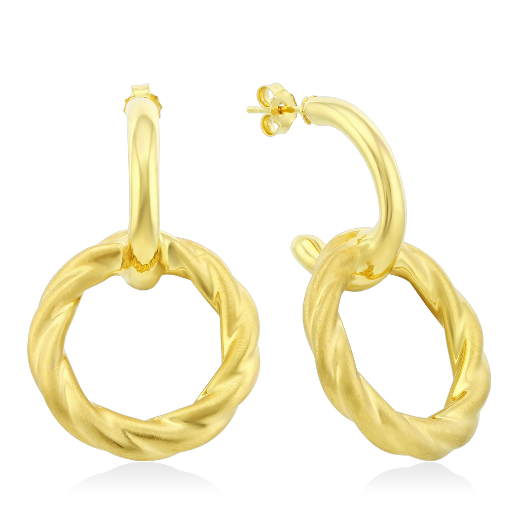 Эти серьги выполнены из облегченных колец разного диаметра, неподвижно закрепленных между собой. Нижнее кольцо матовое и закручено в спираль. Пусетный замок можно регулировать по необходимости, поэтому он всегда надежно держит серьги и удобен в использовании.