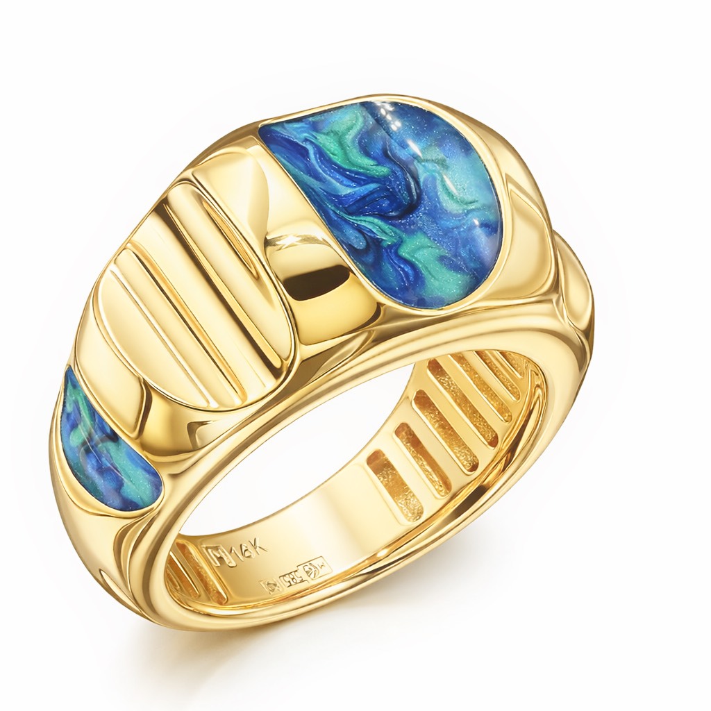 Зеркальная поверхность частично покрыта яркой цветной эмалью, что придает кольцу изысканный шарм и акцентирует внимание окружающих.