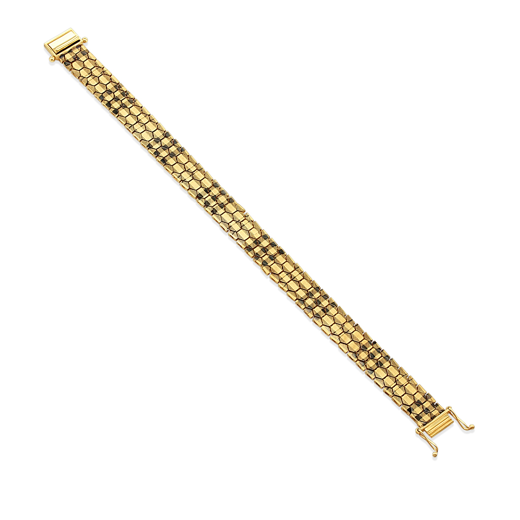 Браслет ювелирный мягкий изготовлен из желтого золота 585 пробы. Браслет состоит из плоских звеньев, которые закреплены между собой на петлях. Такая технология позволяет придать браслету мягкость и гибкость, словно он выполнен из кожи рептилии.